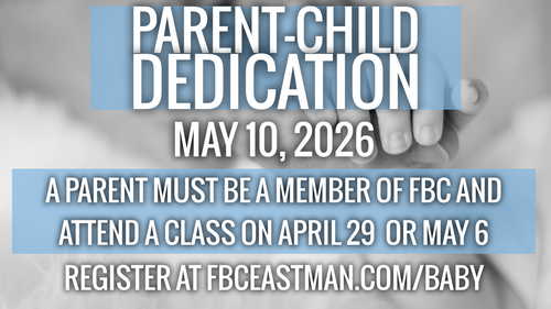 We will have parent-child dedication on May 10, 2026 . To participate, at least one parent must be a member of FBC Eastman and attend a class on either April 29 (10:00-11:00AM) during CORE Groups or May 6 (6:45-7:45 PM). These classes will be held in the Children's building. To register, click the link below.